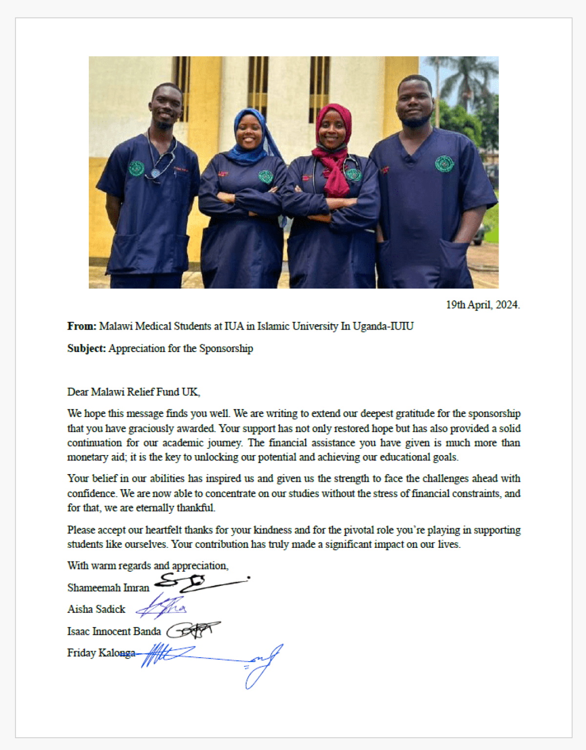 Letter of Gratitude Letter of Gratitude - Malawi Relief Fund UK